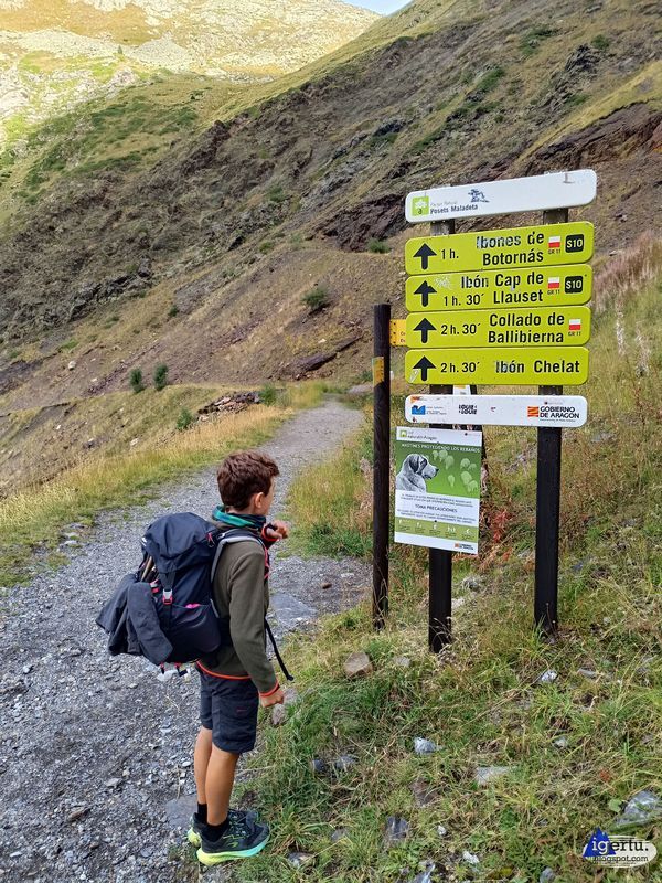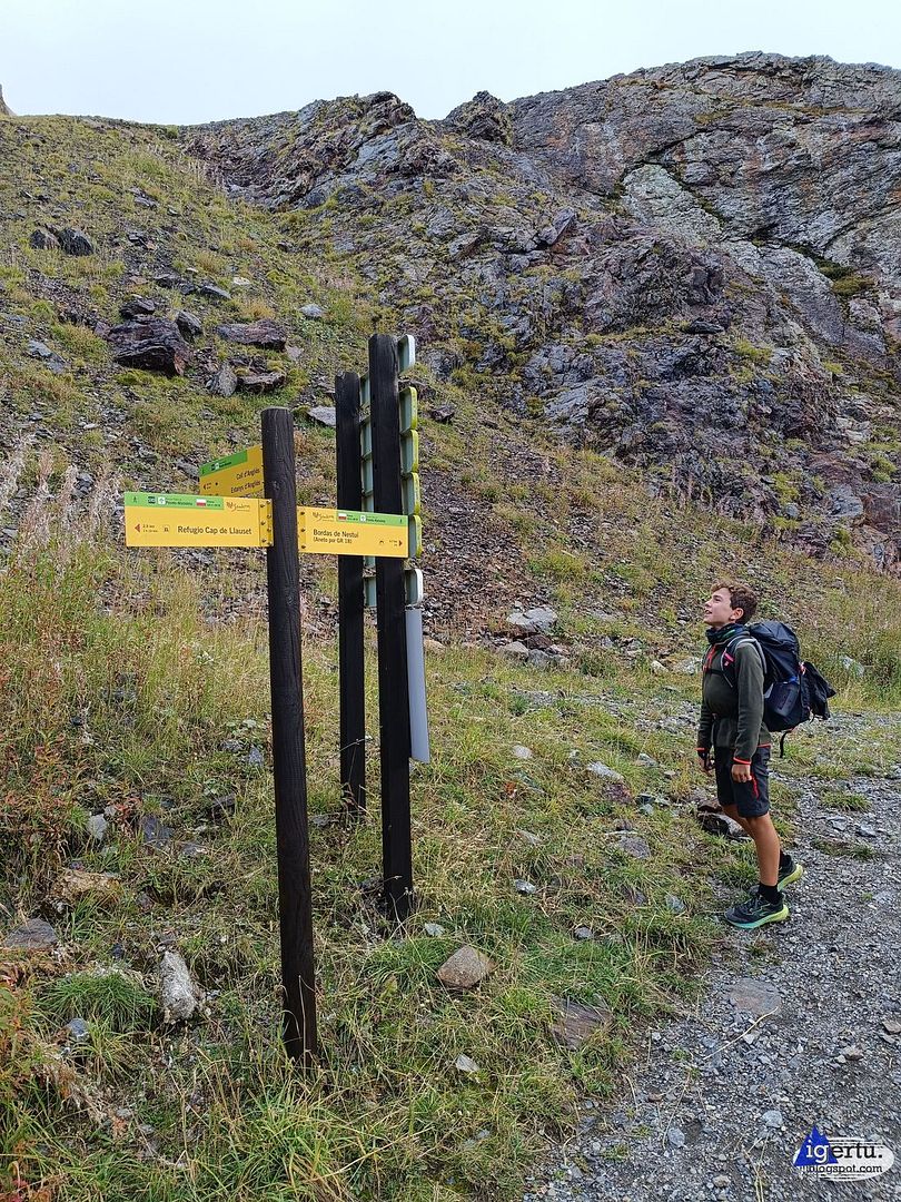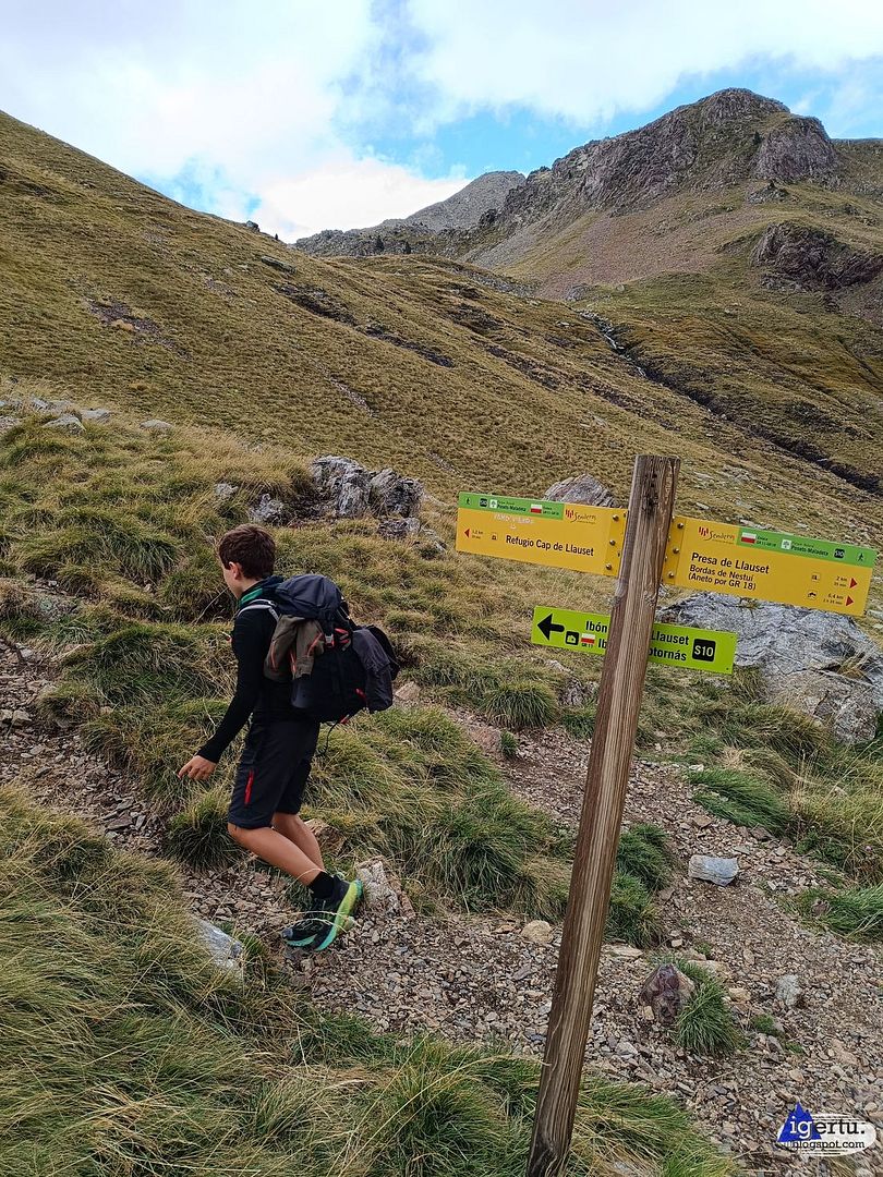 Una vez en la cabecera del embalse de Llauset el sendero asciende hasta toparnos con un poste indicador.