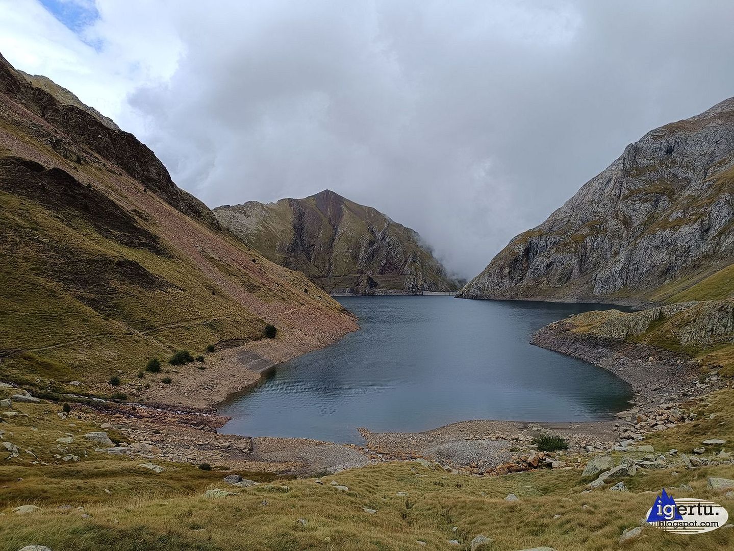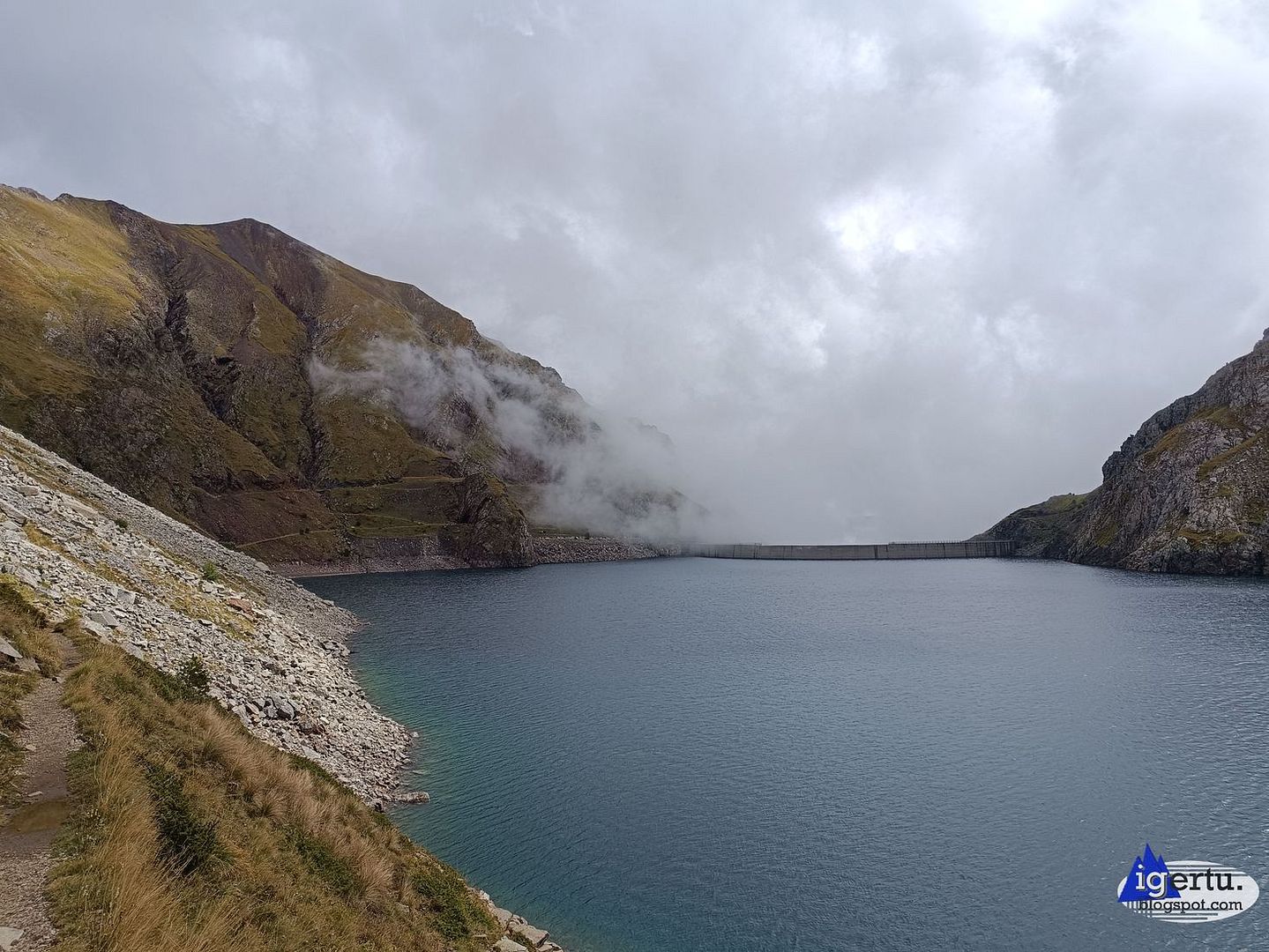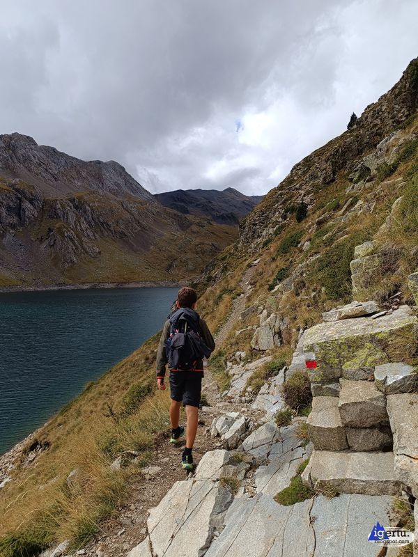 14:15 (00,0km) -> Nada más salir del embalse de Llauset (2198m), pasamos un pequeño túnel excavado en la roca que nos lleva a una intersección con un poste indicador. Dejamos a la derecha la pista que lleva al collado de Anglios, para seguir bordeando el embalse por su lado norte.