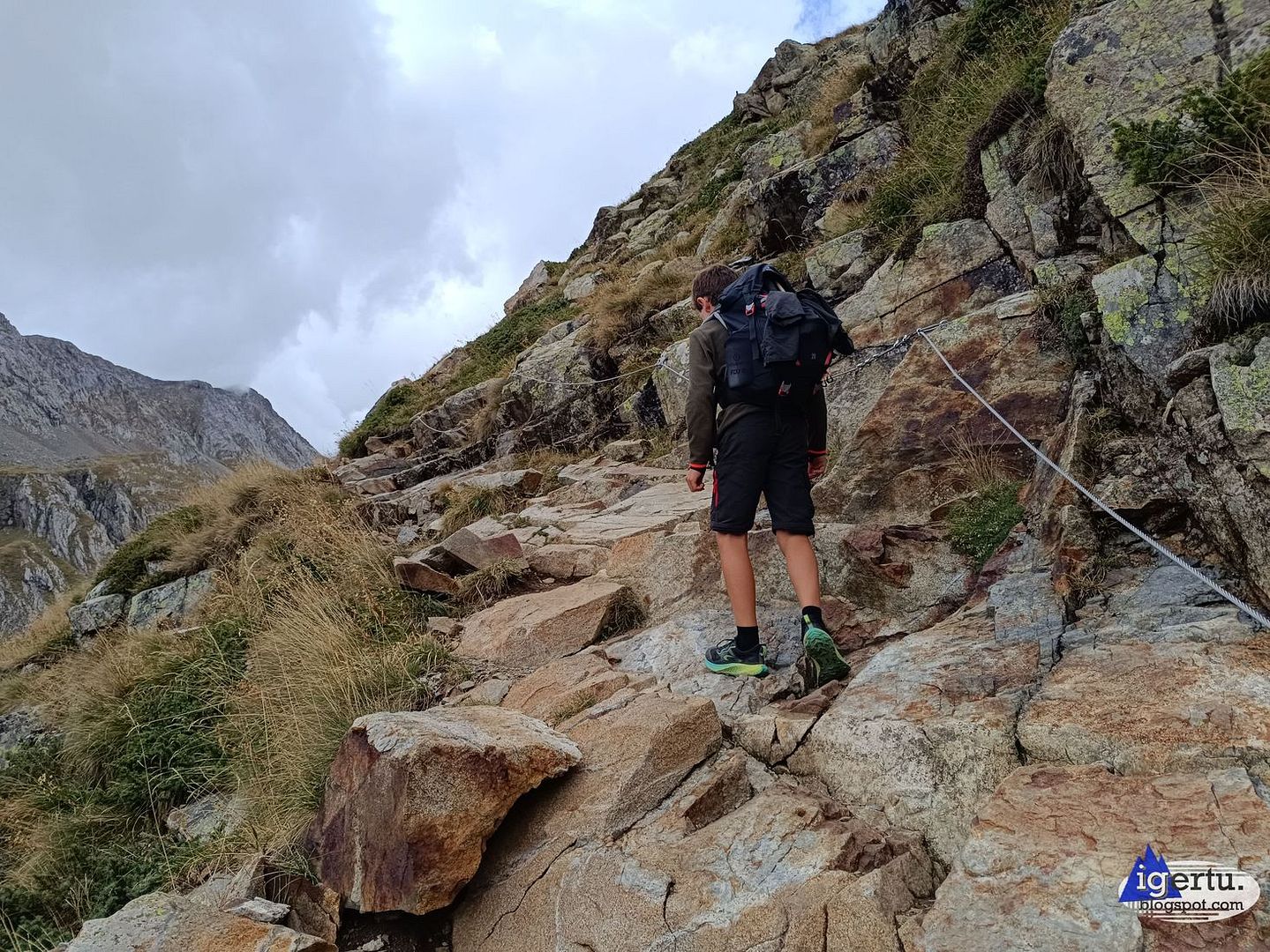 El sendero va recorriendo la orilla norte, en el bordeo pasamos por una zona equipada con un cable de acero, será para cuando la roca esté mojada o haya nieve.