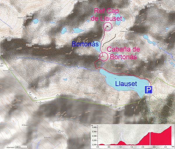 Se parte desde el embalse de Llauset, para llegar a él hay que seguir la pista (10km aprox.) que sale de la localidad de Aneto, se puede transitar con un turismo, pero hay que recordar que es una pista sin cuidado alguno.