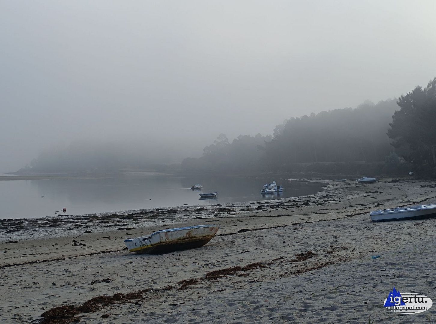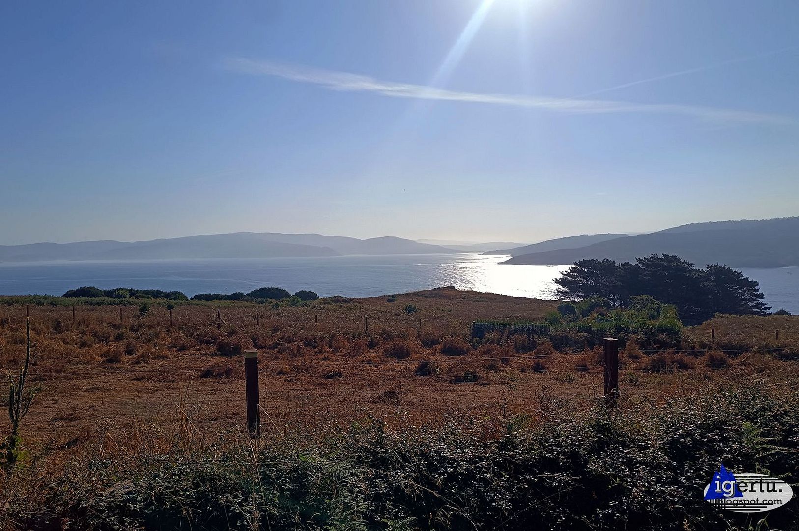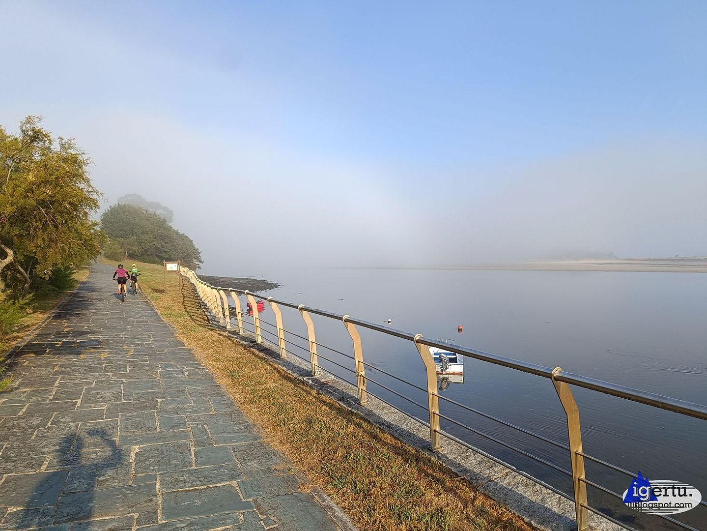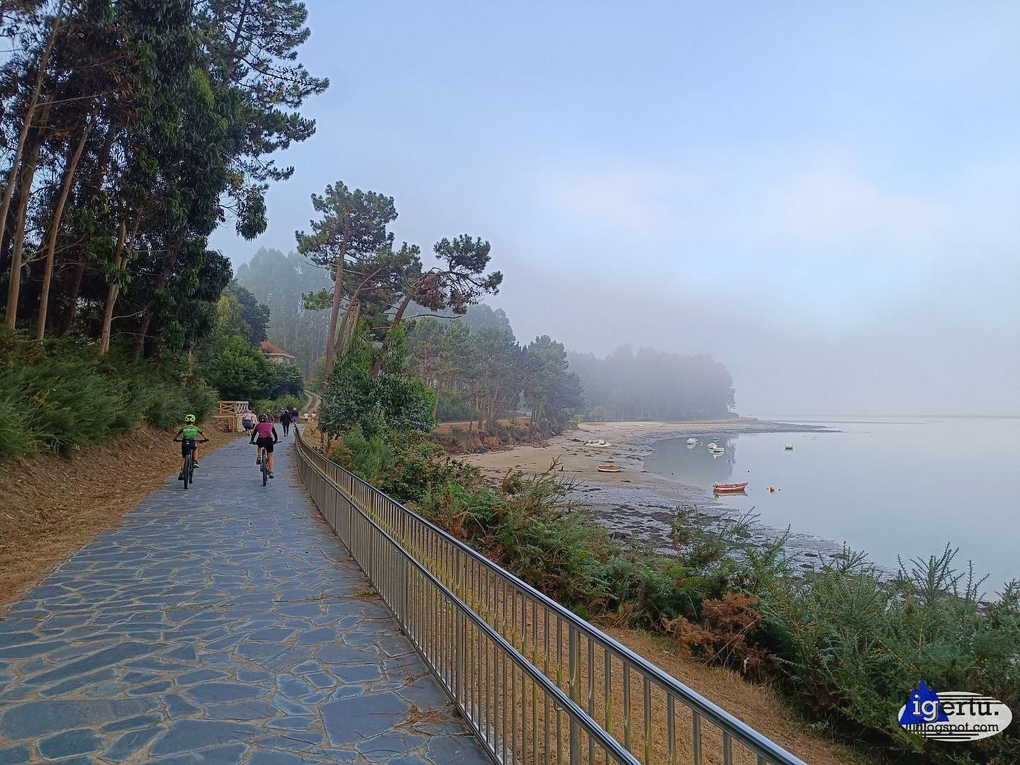 08:45 (00,0km) -> Salimos de Ponteceso (8m) entre la bruma de la ría de Corme e Laxe, cruzando el puente al sur. Tras ascender por carretera un par de kilómetros, enseguida tomamos el desvío hacía la derecha que nos desciende al paseo marítimo. El paseo junto al mar atraviesa la playa de Pendon, dónde estuvimos ayer y circulamos por él hasta As Grelas.
