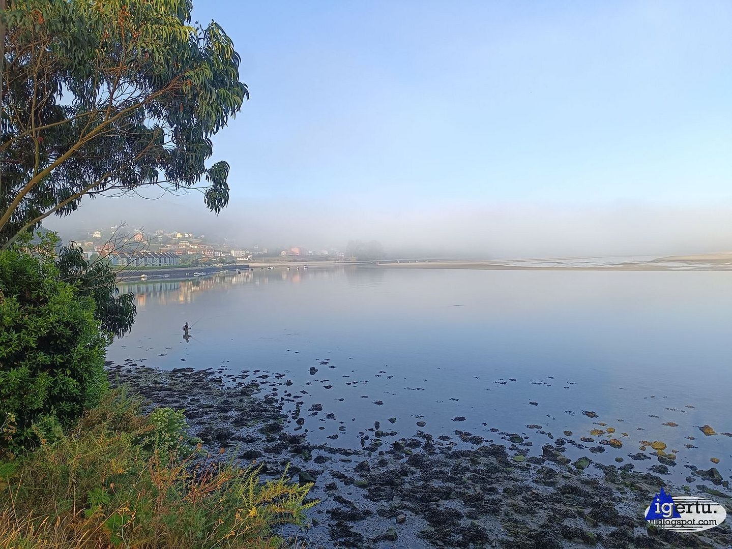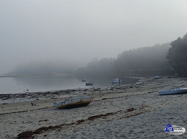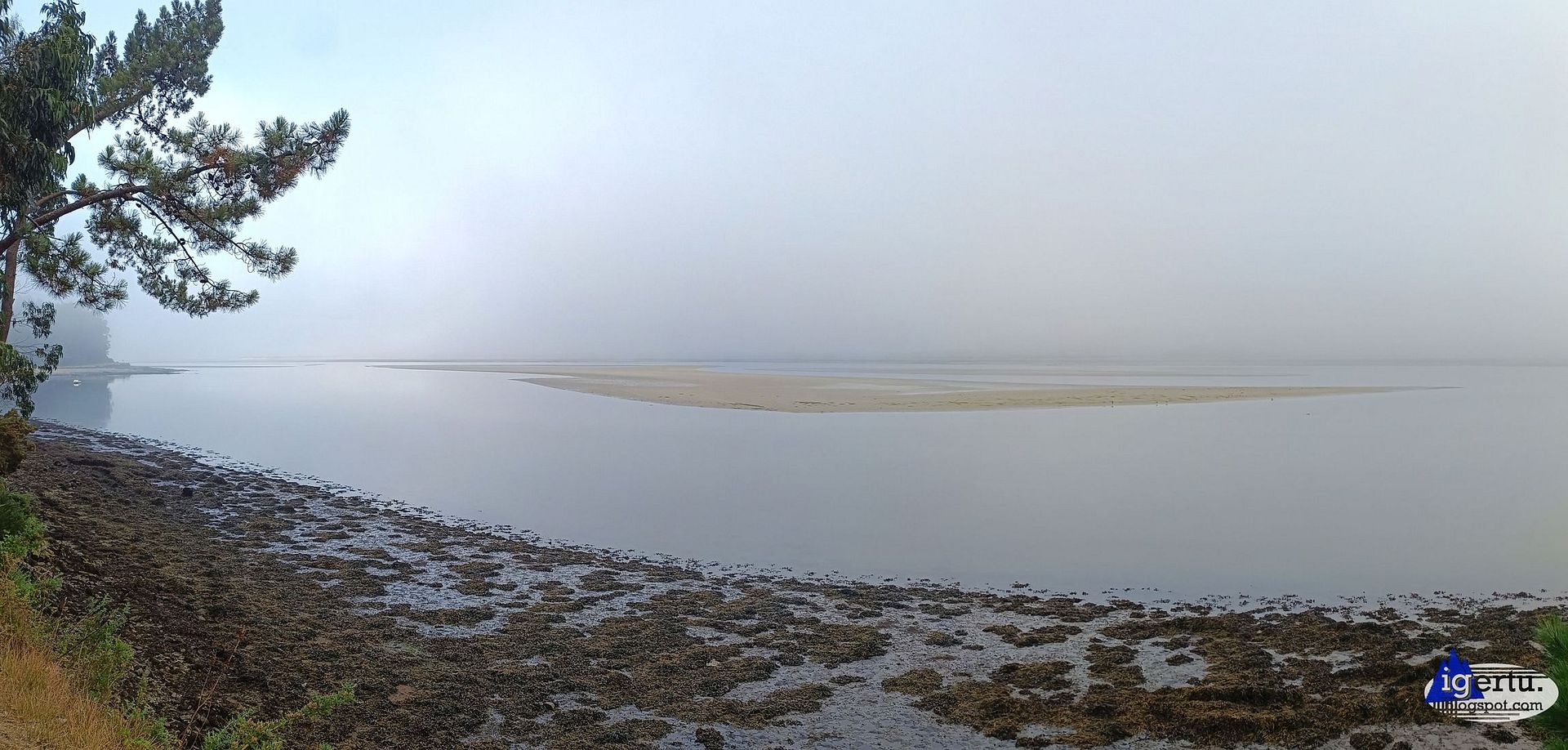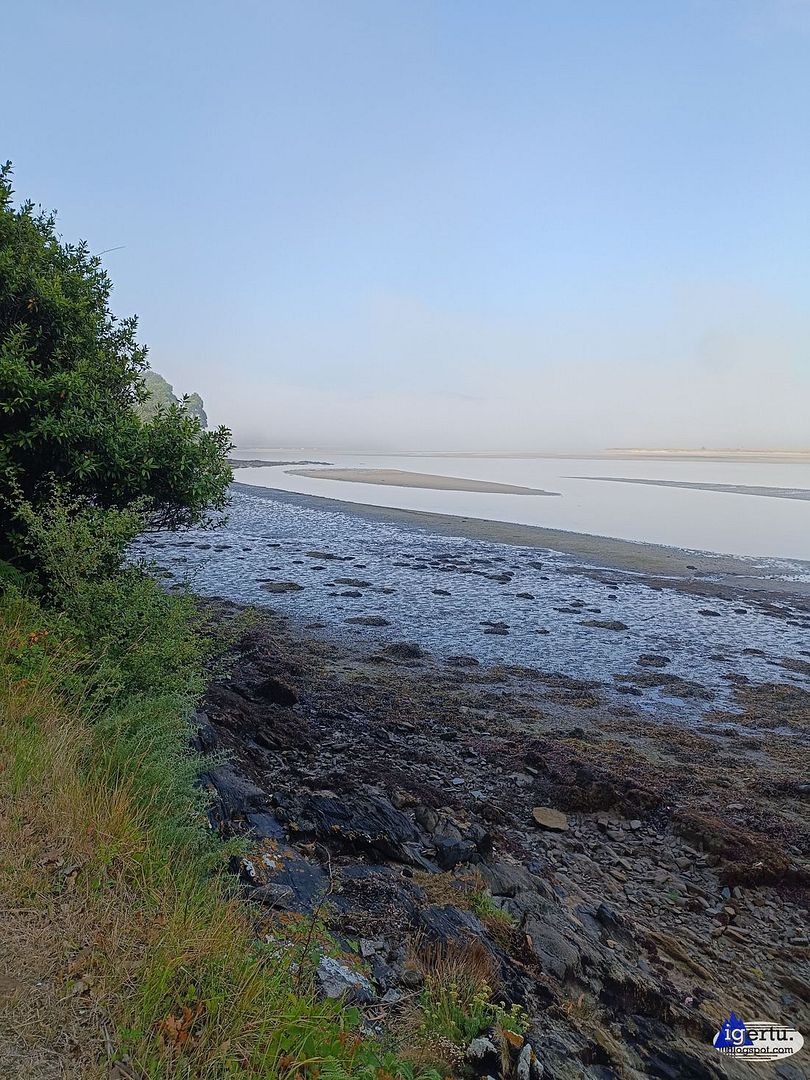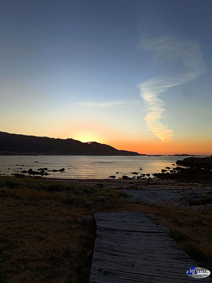 08:45 (00,0km) -> Salimos de Ponteceso (8m) entre la bruma de la ría de Corme e Laxe, cruzando el puente al sur. Tras ascender por carretera un par de kilómetros, enseguida tomamos el desvío hacía la derecha que nos desciende al paseo marítimo. El paseo junto al mar atraviesa la playa de Pendon, dónde estuvimos ayer y circulamos por él hasta As Grelas.