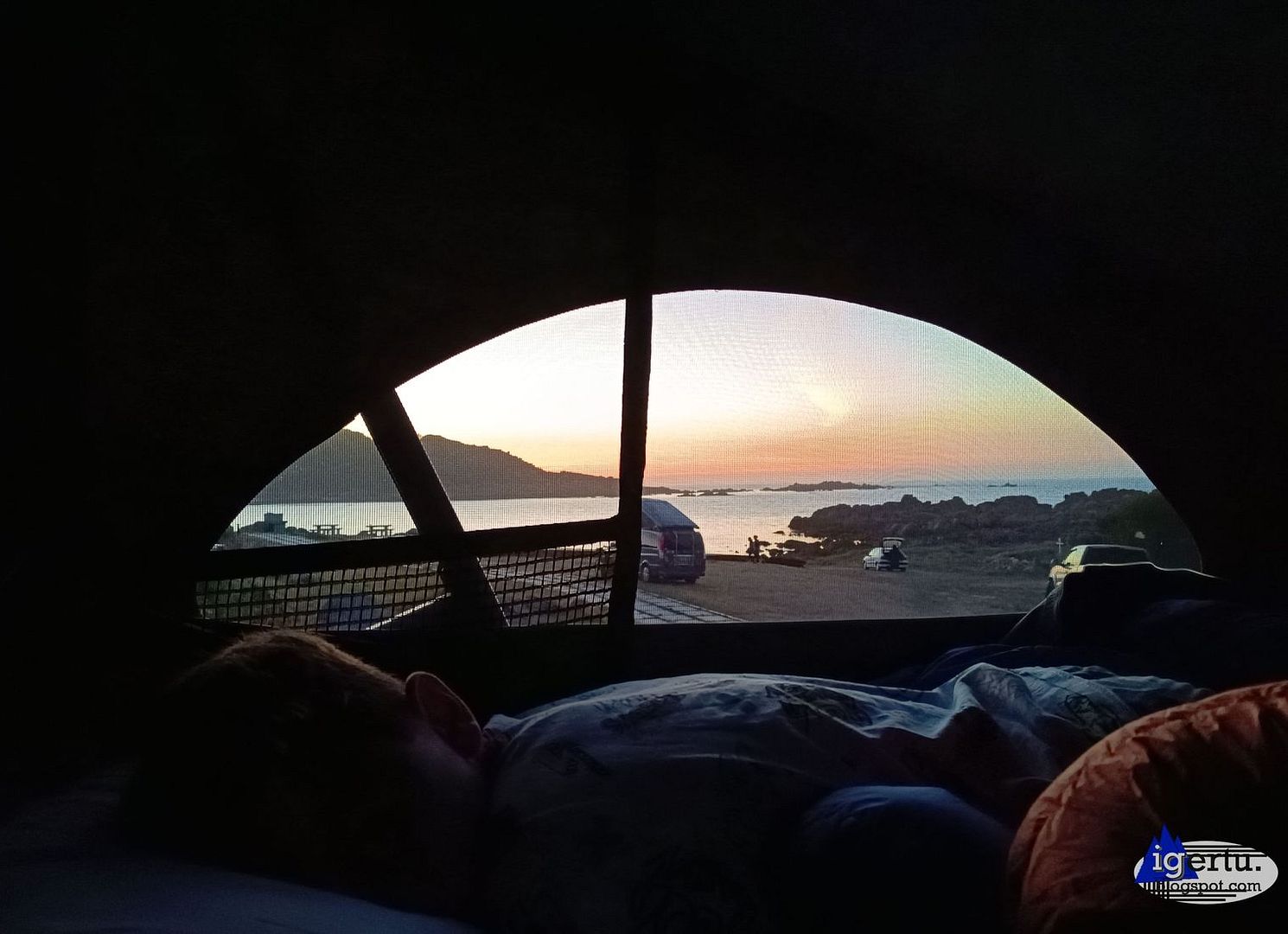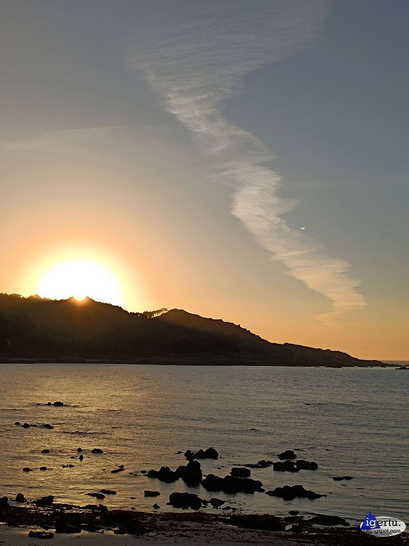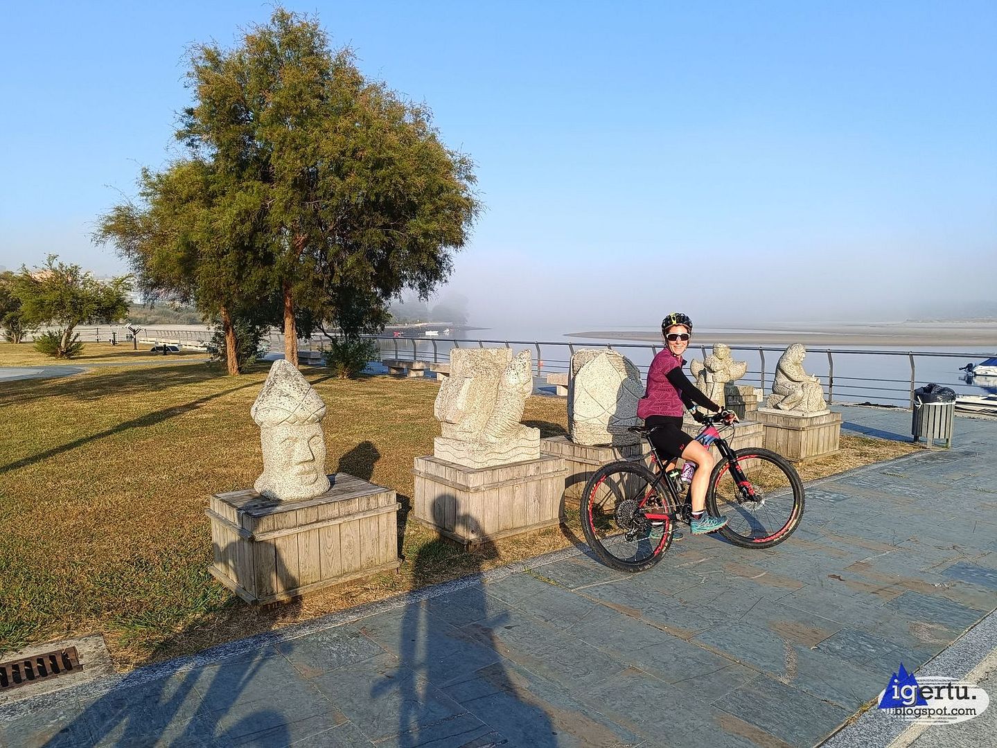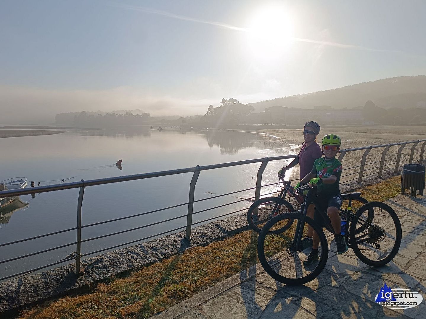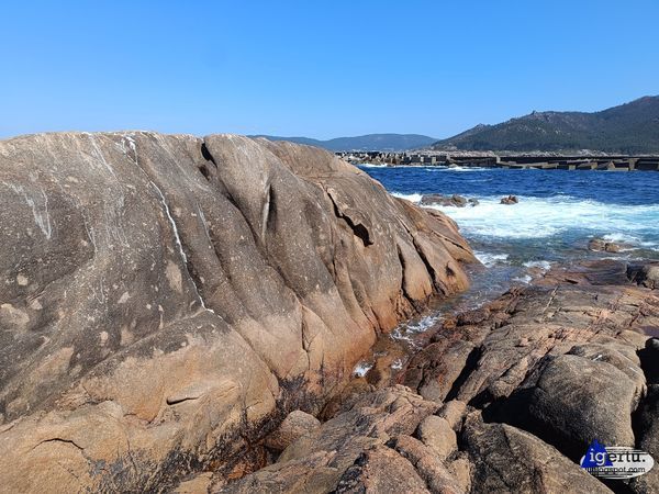 08:45 (00,0km) -> Salimos de Ponteceso (8m) entre la bruma de la ría de Corme e Laxe, cruzando el puente al sur. Tras ascender por carretera un par de kilómetros, enseguida tomamos el desvío hacía la derecha que nos desciende al paseo marítimo. El paseo junto al mar atraviesa la playa de Pendon, dónde estuvimos ayer y circulamos por él hasta As Grelas.