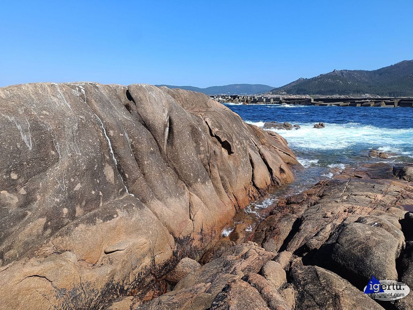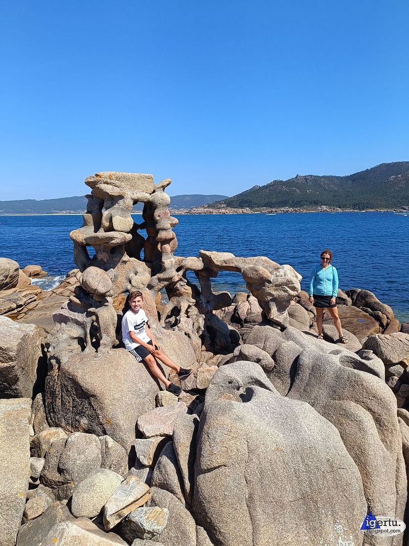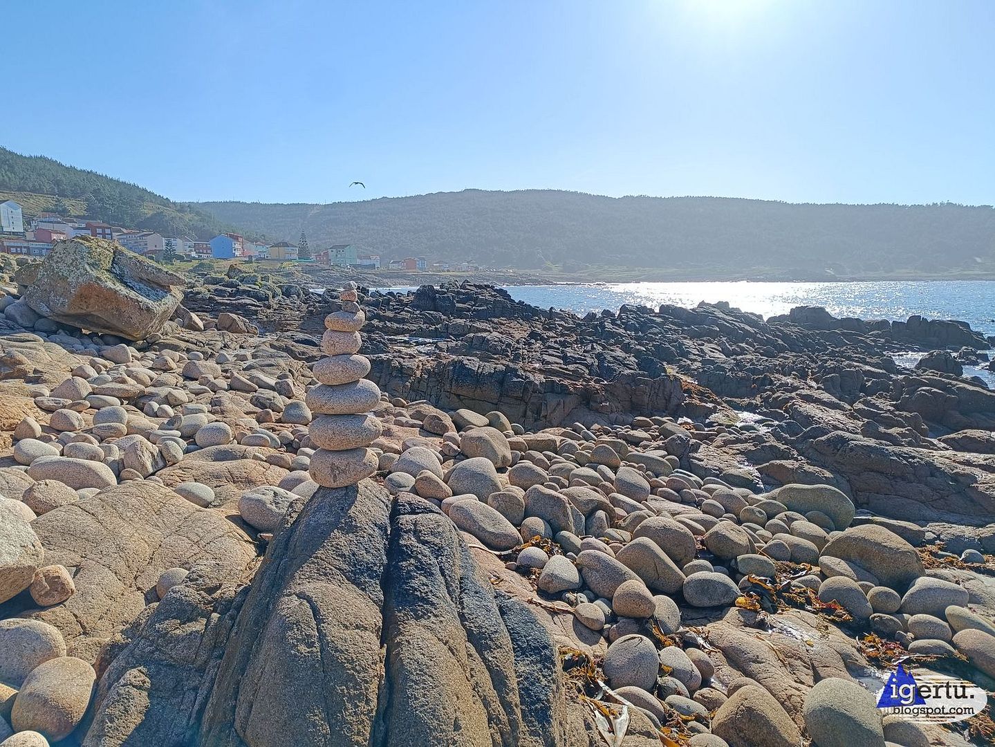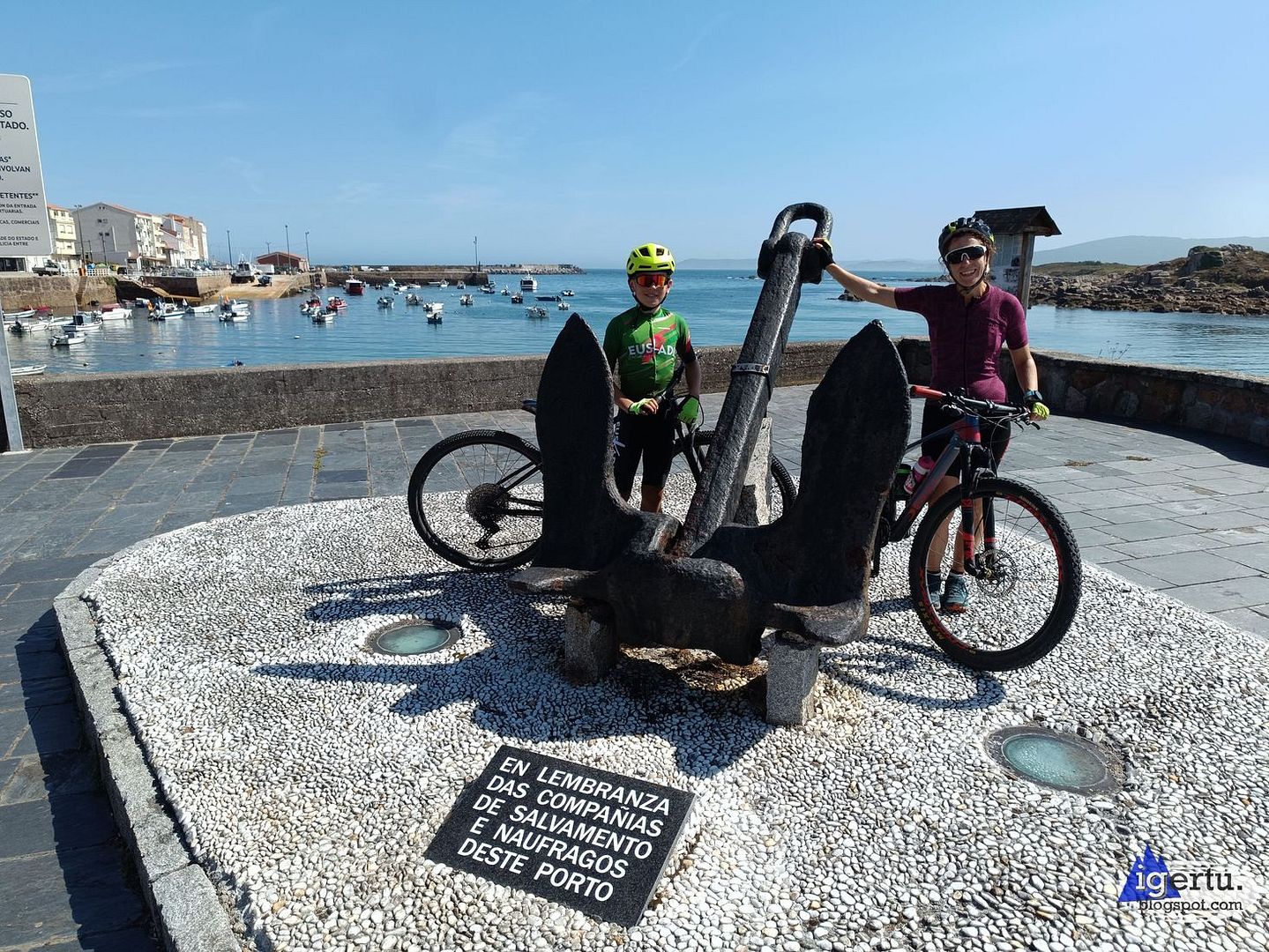 En el otro extremo del pueblo visitamos la iglesia de Santa María de Atalaya, desde donde iniciamos el trayecto hacia el faro de Laxe. Un tramo breve de sube baja nos deja junto al modesto faro, en el otro extremo de la ría podemos ver el faro de Roncudo, por donde pasamos ayer. Un señor ávido de contar historias, relata sobre los naufragios sucedidos en el lugar a unos paseantes junto a una escultura próxima a nuestro paso.