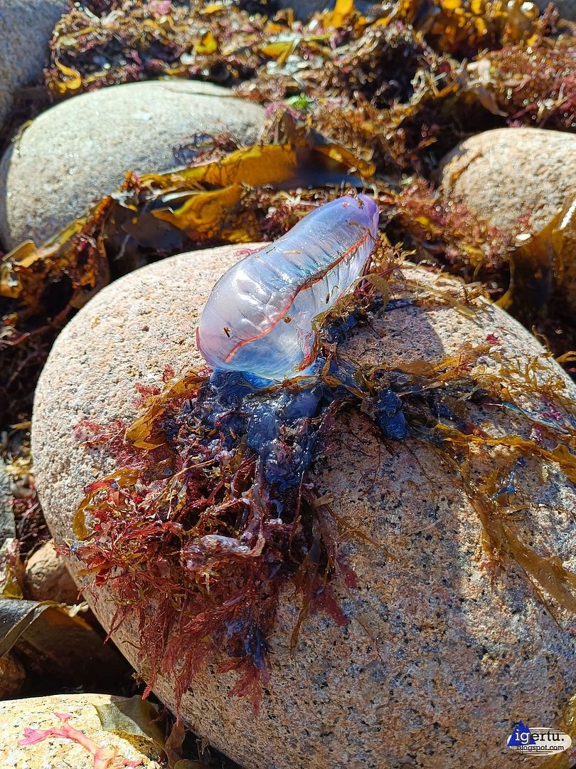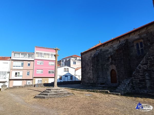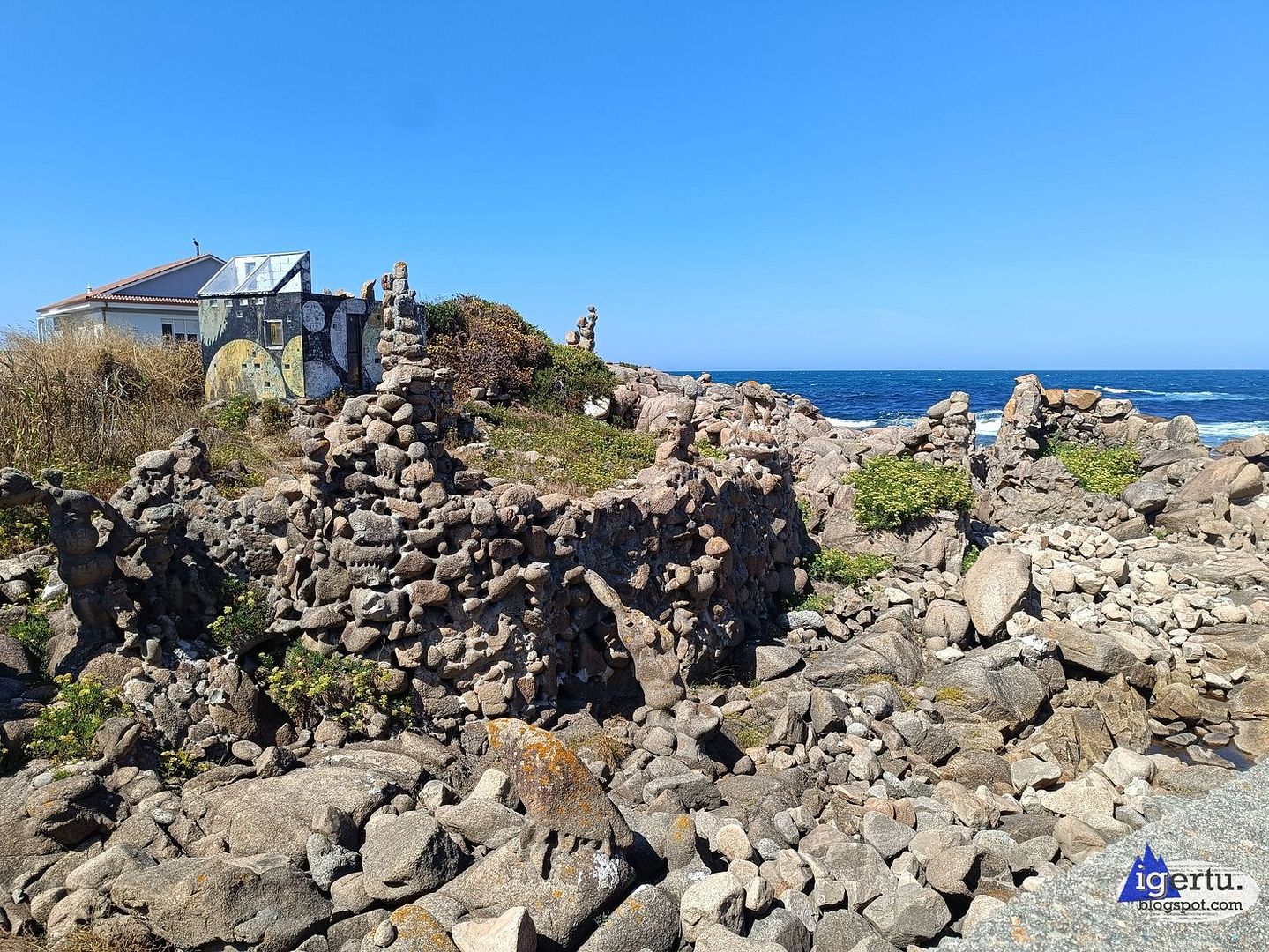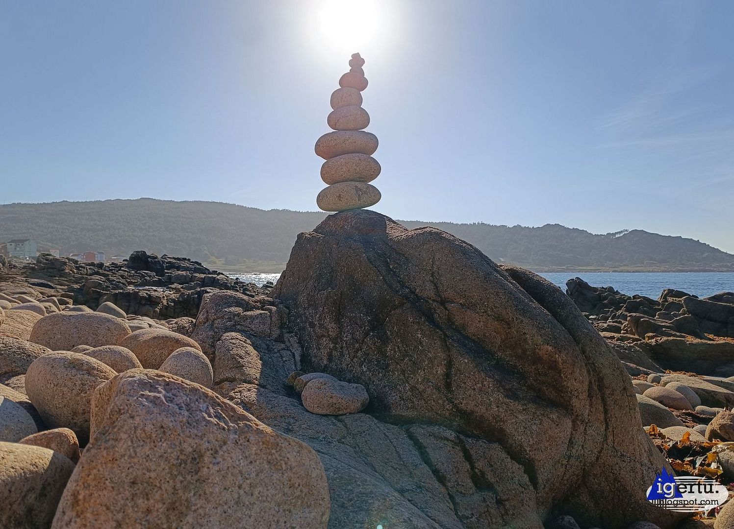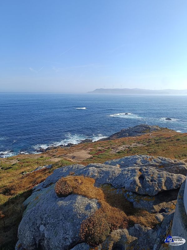 En el otro extremo del pueblo visitamos la iglesia de Santa María de Atalaya, desde donde iniciamos el trayecto hacia el faro de Laxe. Un tramo breve de sube baja nos deja junto al modesto faro, en el otro extremo de la ría podemos ver el faro de Roncudo, por donde pasamos ayer. Un señor ávido de contar historias, relata sobre los naufragios sucedidos en el lugar a unos paseantes junto a una escultura próxima a nuestro paso.