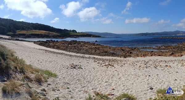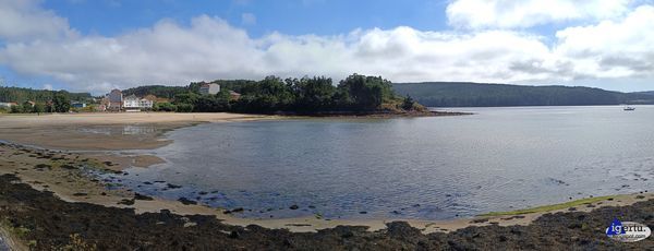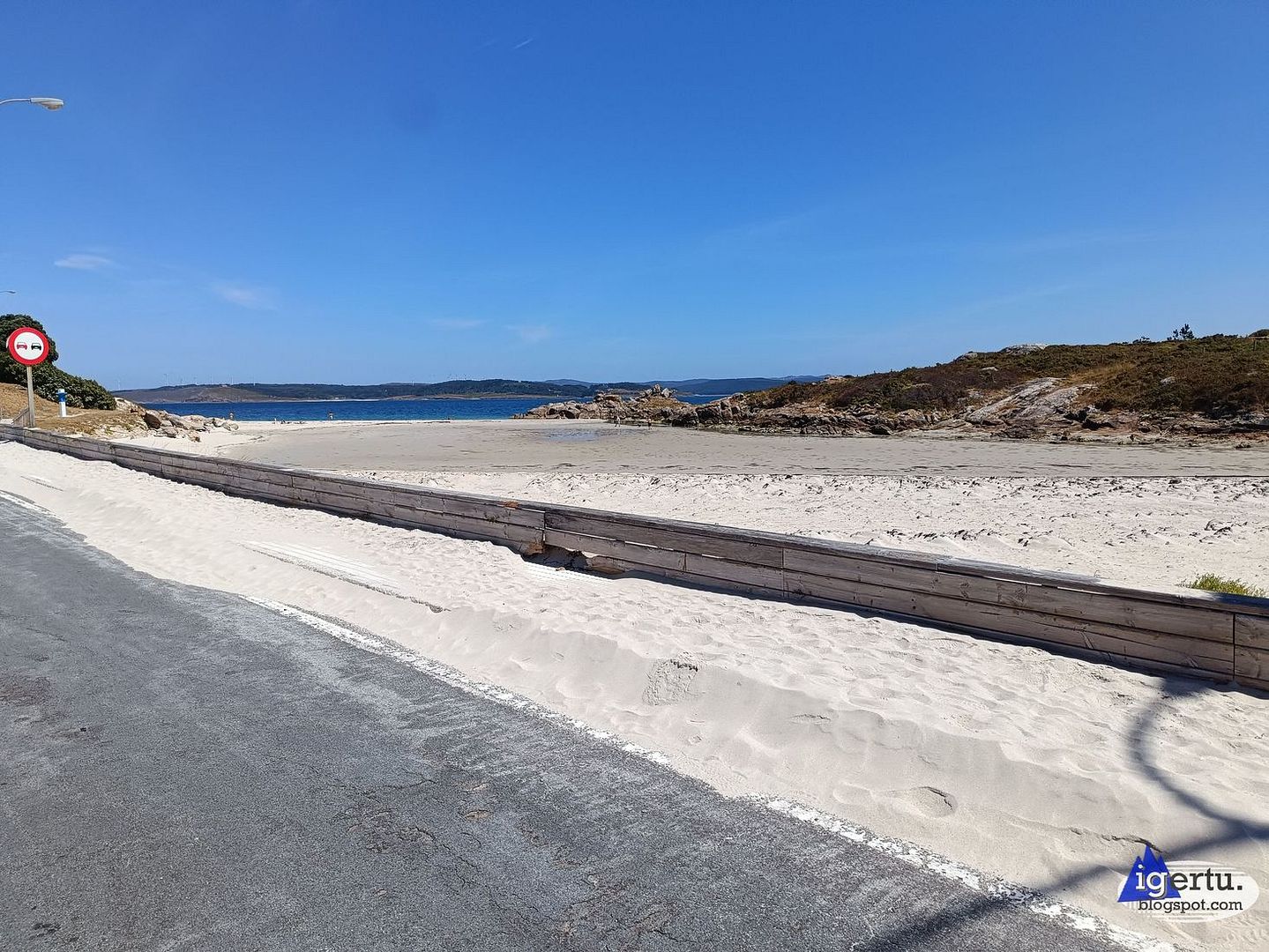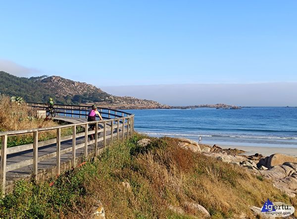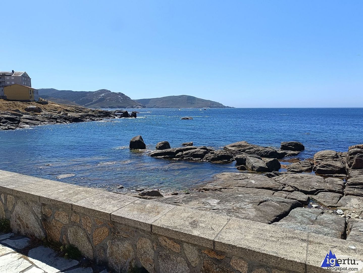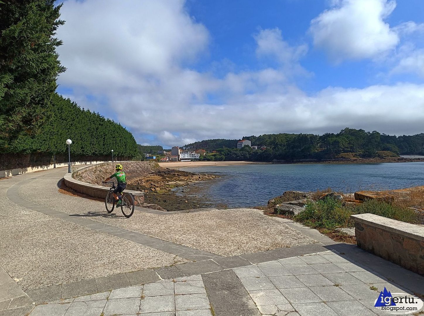 08:59 (02,0km) -> Tras la foto de rigor en Camelle (8m) retornamos a Arou, su playa y entorno son increíbles, los bancos de arena fina despuntan entre el granito rojizo, recorremos el malecón que a estas horas no presenta el bullicio de ayer, para afrontar el primer ascenso del día, en la costa gallega no hay largas ascensiones, pero es un continuo sube baja que nos hará acumular metros de desnivel.