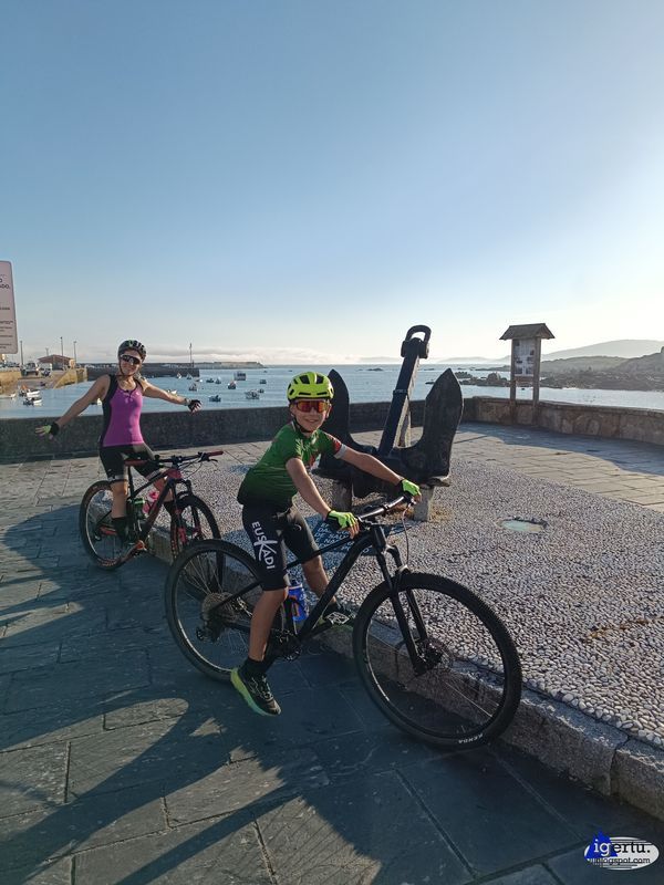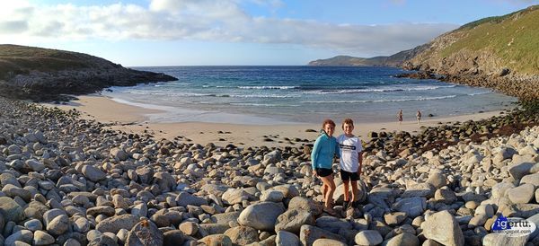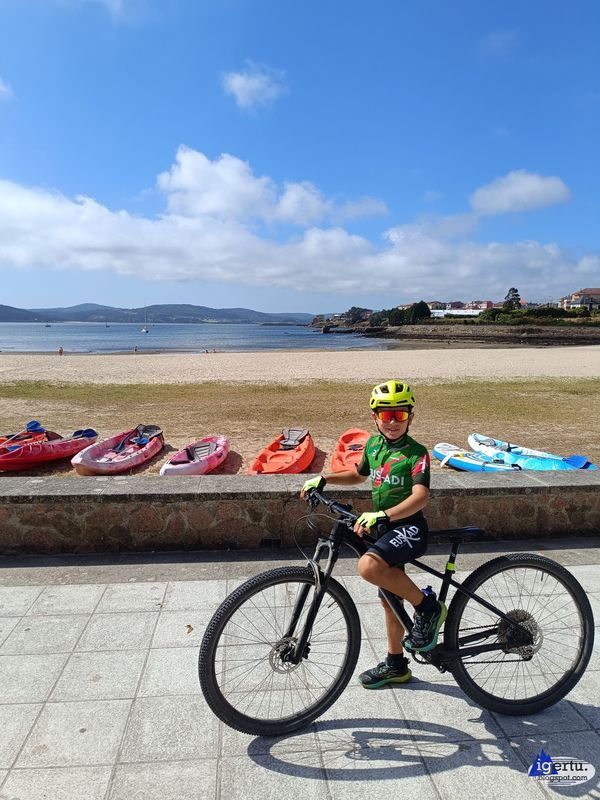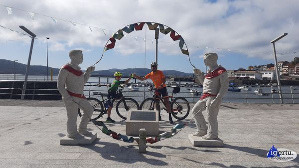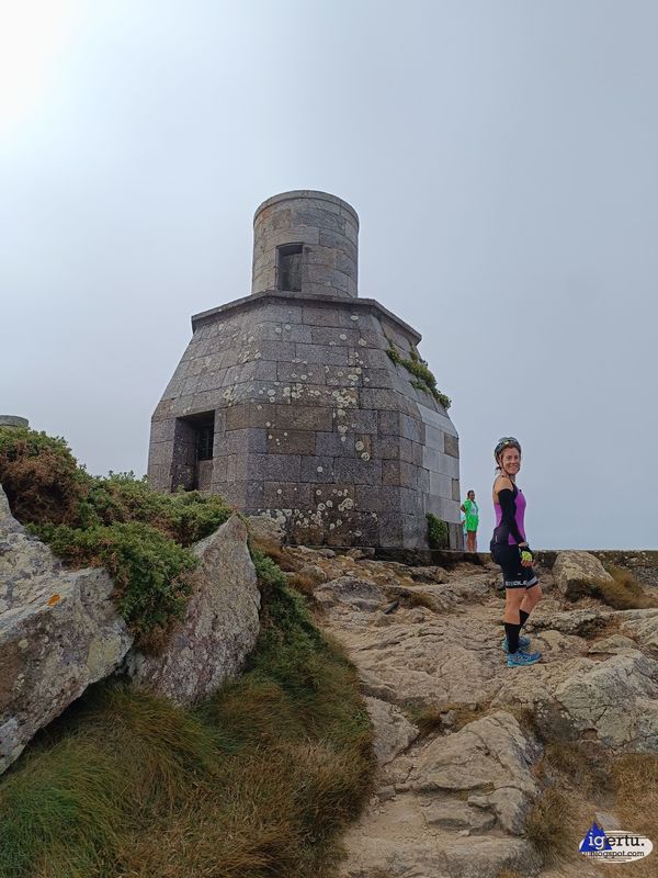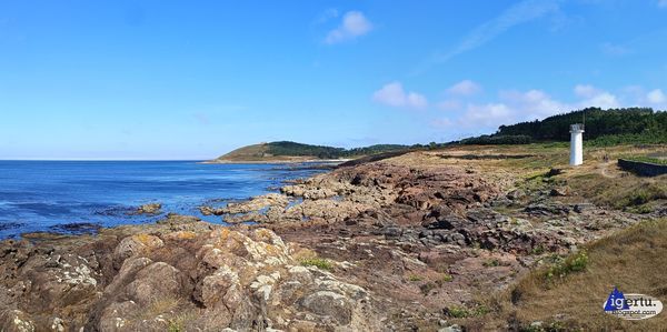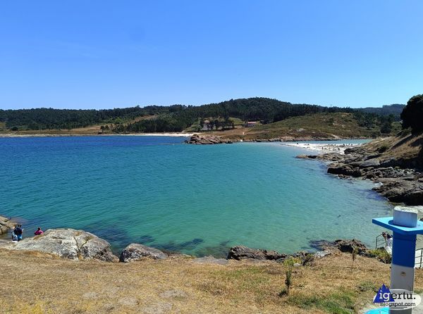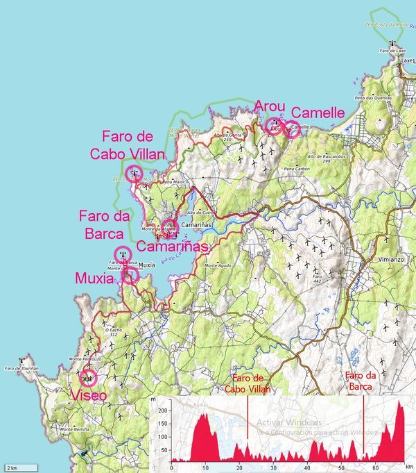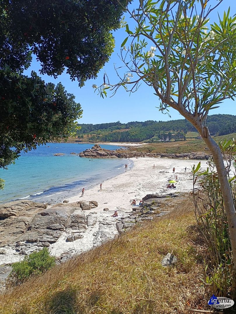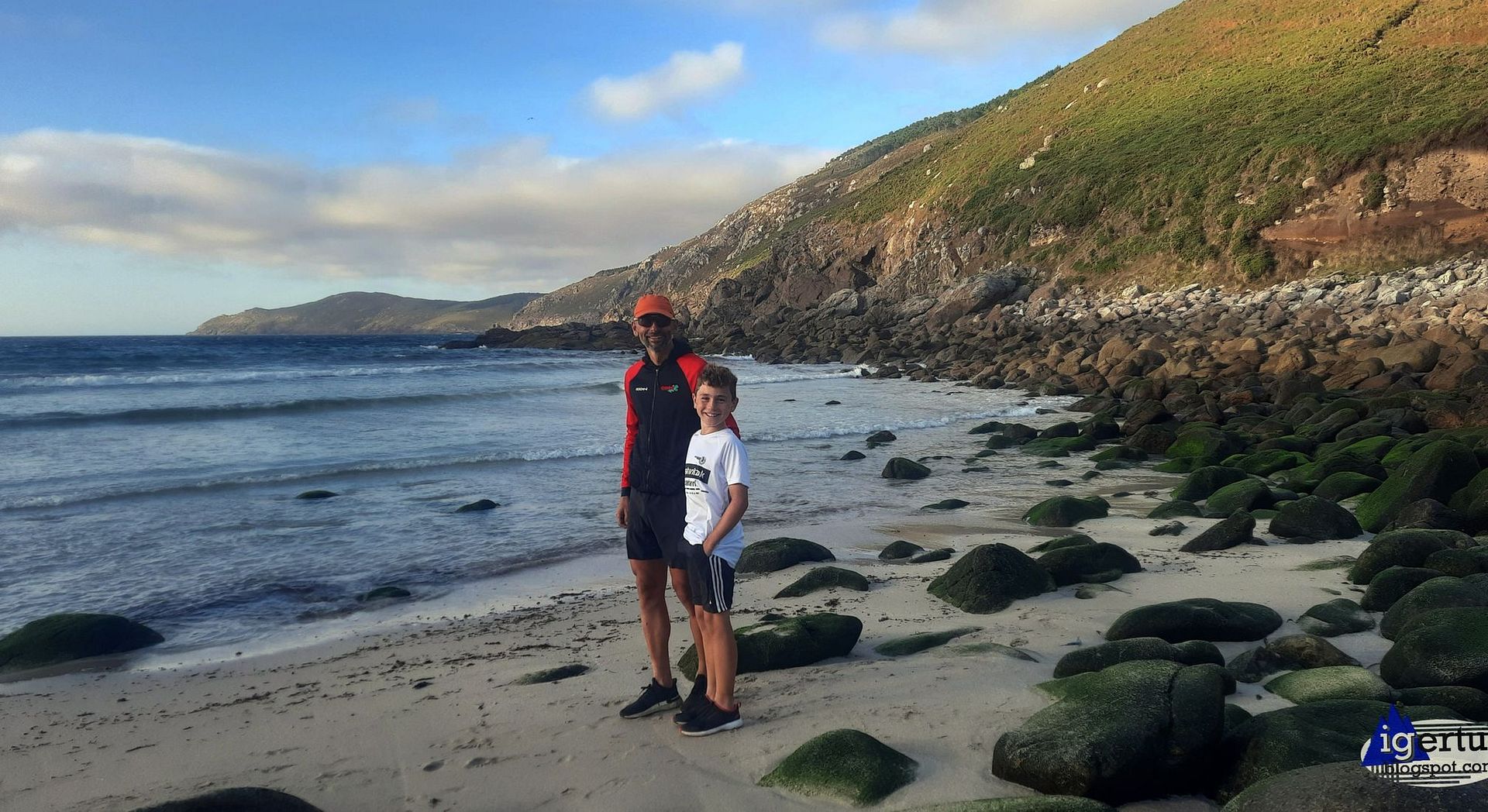 08:59 (02,0km) -> Tras la foto de rigor en Camelle (8m) retornamos a Arou, su playa y entorno son increíbles, los bancos de arena fina despuntan entre el granito rojizo, recorremos el malecón que a estas horas no presenta el bullicio de ayer, para afrontar el primer ascenso del día, en la costa gallega no hay largas ascensiones, pero es un continuo sube baja que nos hará acumular metros de desnivel.