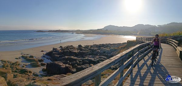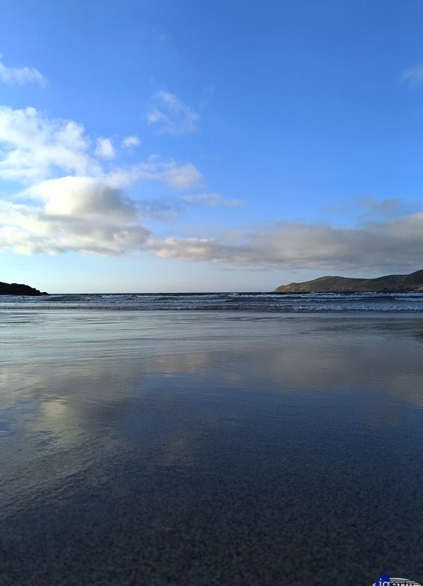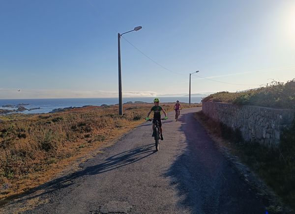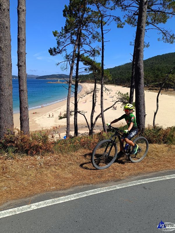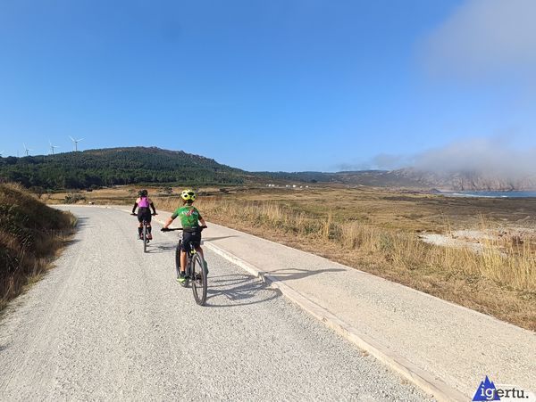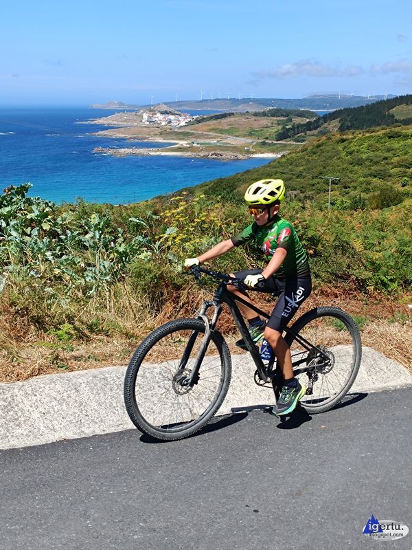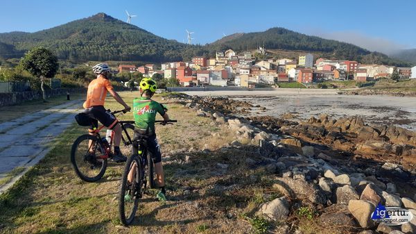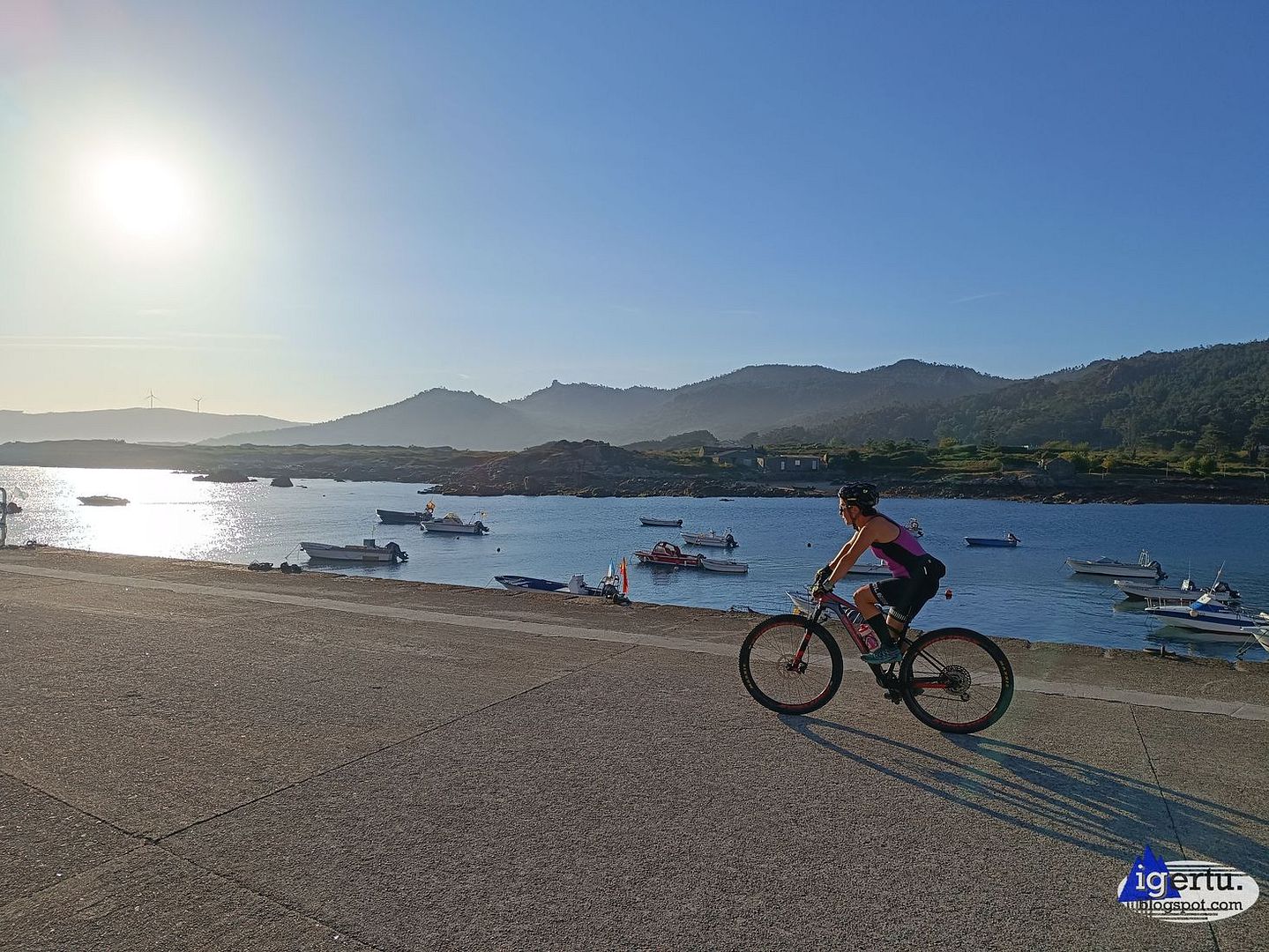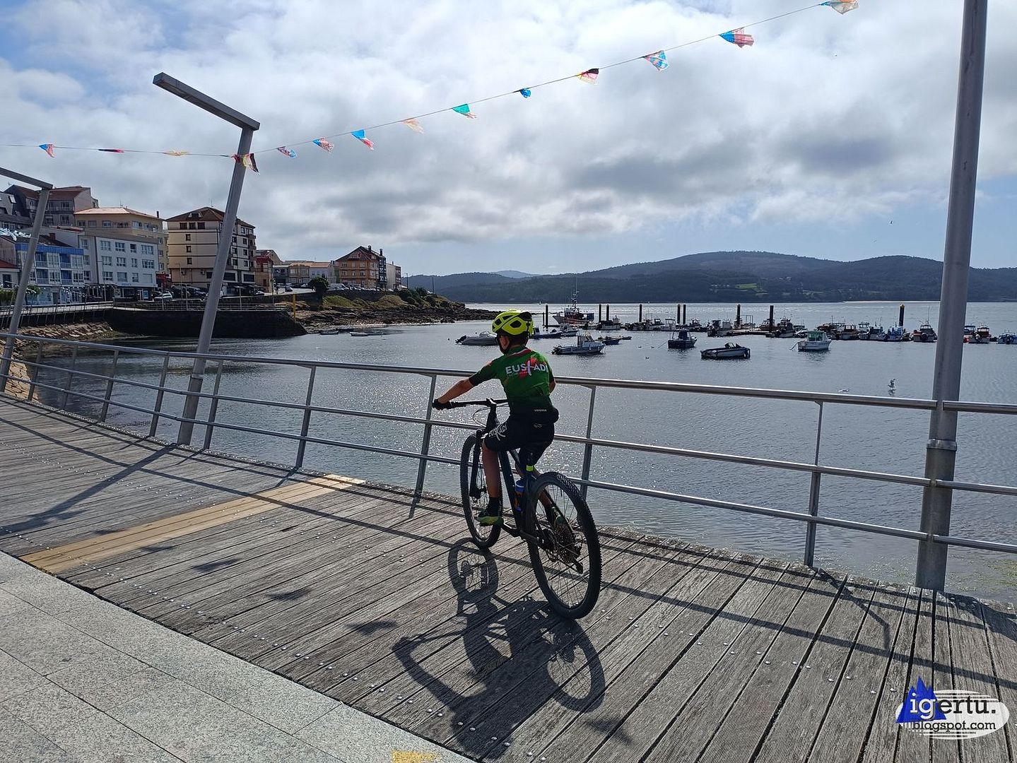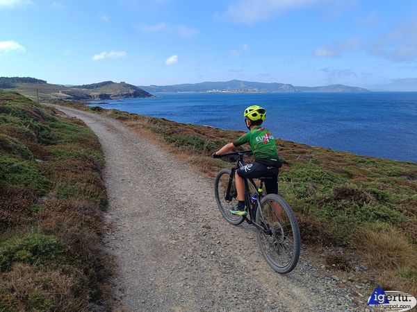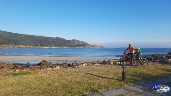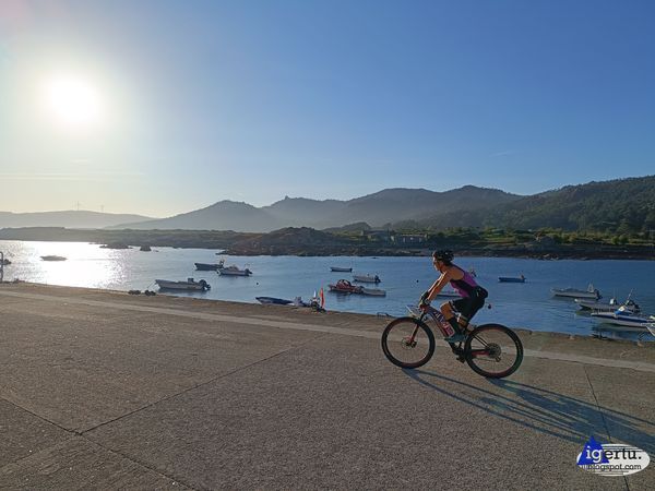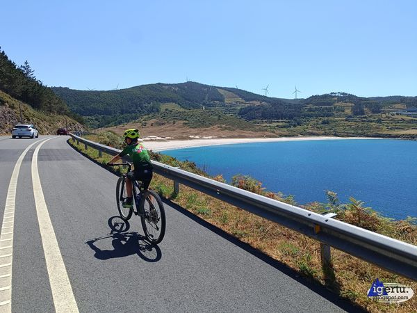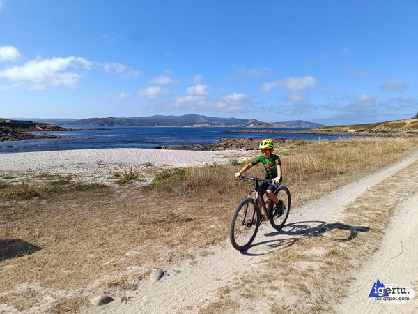 Dejamos atrás la enorme piscifactoría que hay junto al cabo para tomar una pista entretenida que recorre la orilla norte de la ría de Camariñas, aquí estamos resguardados del viento y pedaleamos en un terreno de puro BTT, pasando por espectaculares playas, como la playa del lago norte, antes de llegar a la coqueta Camariñas, con su puerto pesquero protegido de los vientos norte.