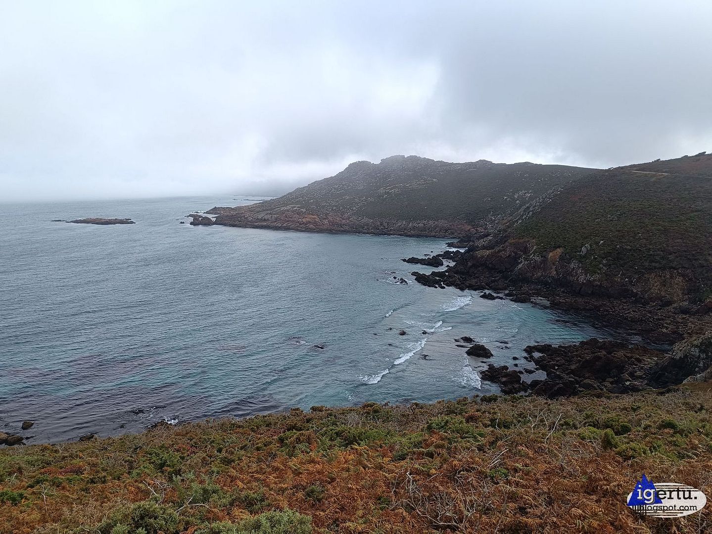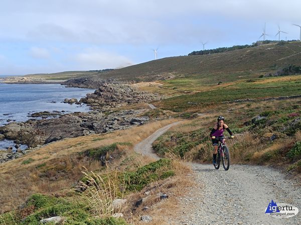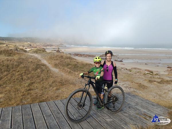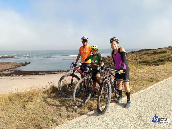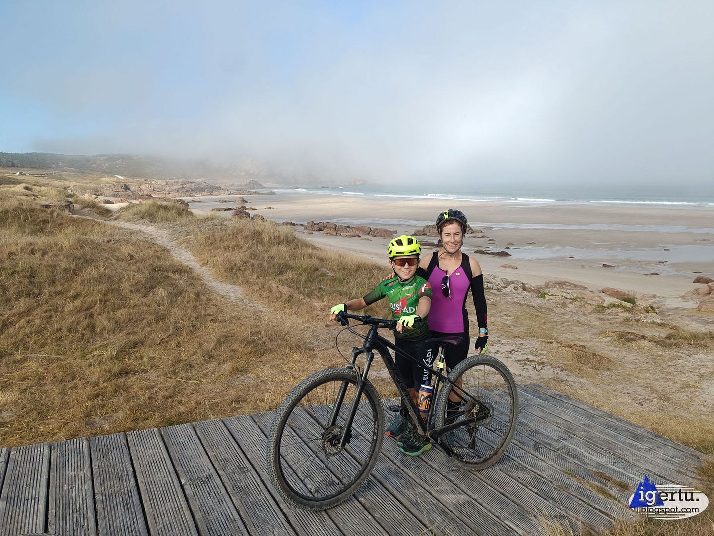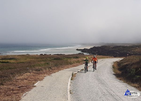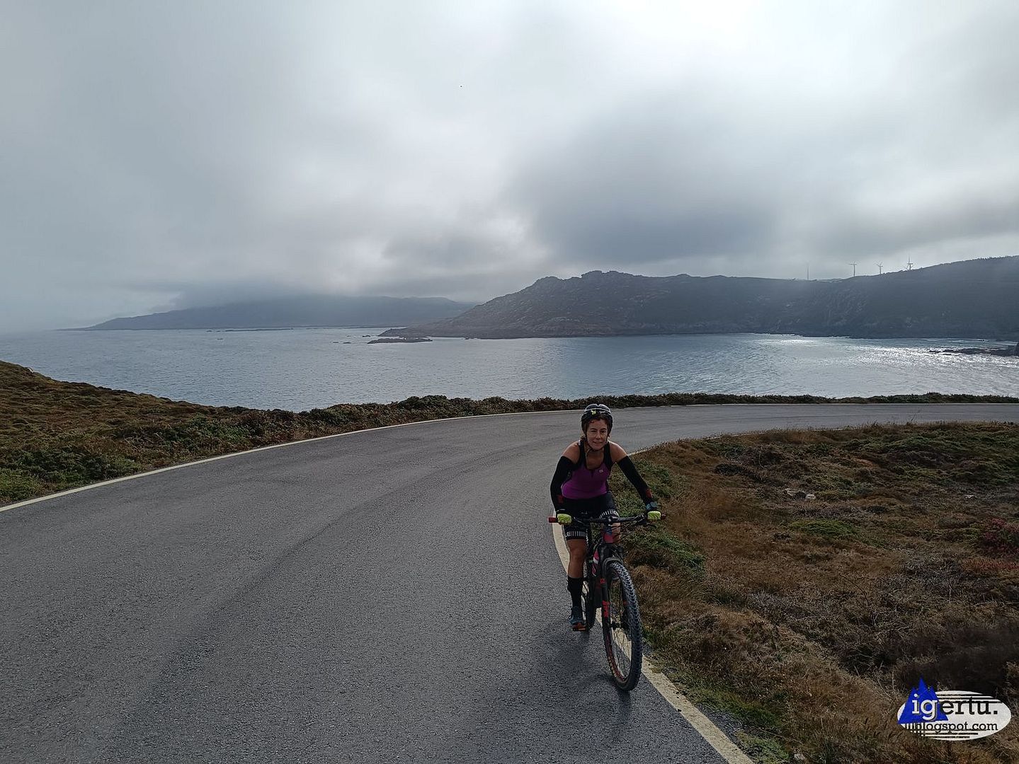 La bruma costera nos engulle en la subida al Alto da Cruz, toca bajar hacia la costa siguiendo la pista de tierra que traemos desde hace kilómetros. Llegamos a las ensenada de Lucin, ahora nos espera un largo trayecto pegados a la costa que con el viento favorable que nos hace volar mientras disfrutamos como enanos.
