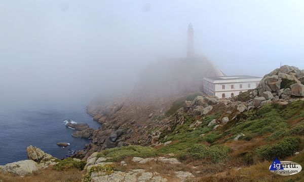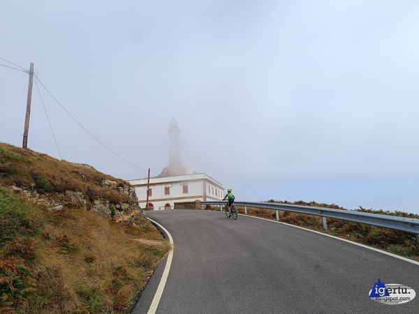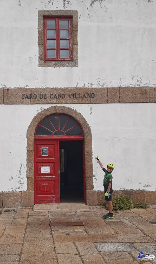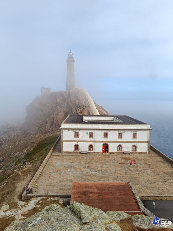 10:49 (22,3km) -> El faro de Cabo Vilán/Villano (66m) es uno de los símbolos más representativos de la Costa da Morte. Construido en 1896 tras el trágico naufragio del buque inglés Serpent en 1890, fue el primer faro eléctrico de España. Se levanta sobre un acantilado de granito a más de 100 metros sobre el nivel del mar, con una torre octogonal de unos 25 metros de altura y una potente luz visible a más de 50 kilómetros. Su arquitectura, de granito rosado local, y su emplazamiento sobre un paisaje abrupto y azotado por el Atlántico, lo convierten en uno de los faros más espectaculares del país.