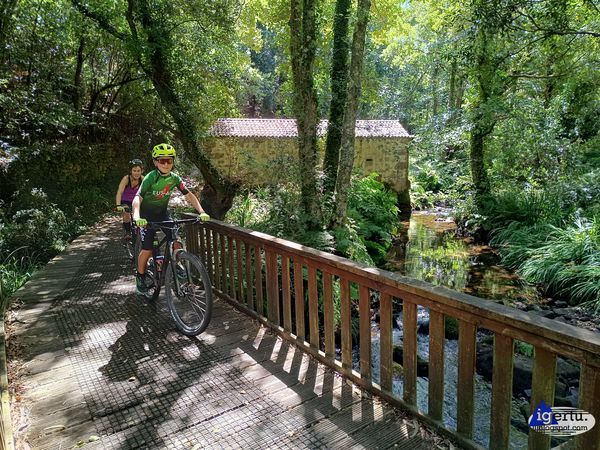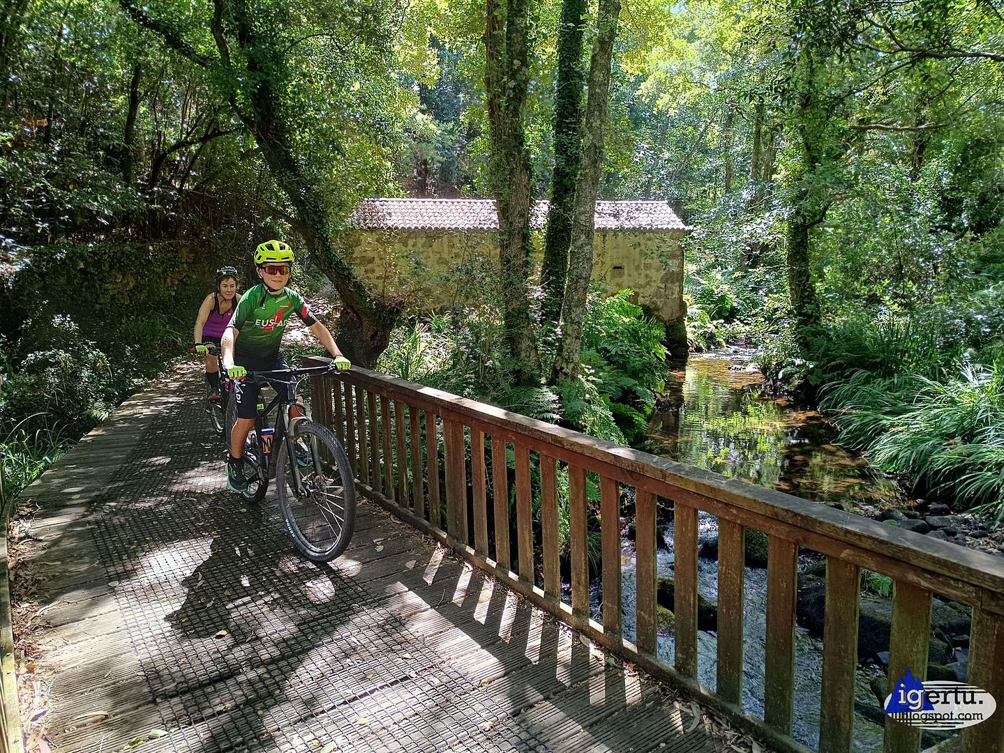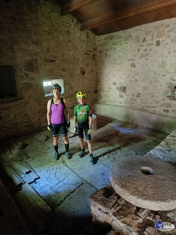 Seguimos rodando por la carretera y tras pasar por otra playa do Lago, nos aproximamos a Os Muiños, donde tomamos el sendero que pasa por los molinos de agua que están en el cauce del río negro. Los molinos no solo tenían función práctica (molían grano), sino que fueron lugares de encuentro social: vecinos y vecinas se reunían mientras esperaban el turno; era uno de los pocos espacios comunes fuera de casa e iglesia.