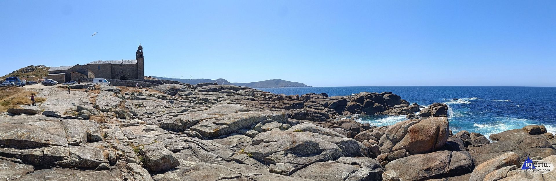 15:33 (56,7km) -> Faro da Barca (Muxia) (15m). Aquí nos encontramos con muchos turistas, seguimos ruta hacia el sur, pasando junto el santuario de nuestra señora da Barca. Según la tradición, la Virgen María llegó allí en una barca de piedra para consolar al apóstol Santiago, y las rocas que rodean el templo serían los restos de esa embarcación, conocidas como las “Pedras da Barca”. El edificio actual, de estilo barroco, se construyó a comienzos del siglo XVIII y ha sido restaurado en varias ocasiones, especialmente tras el incendio de 2013. Situado frente al Atlántico, es destino de peregrinos y escenario de la multitudinaria romería de la Virxe da Barca, que cada septiembre llena Muxía de devoción y mar.