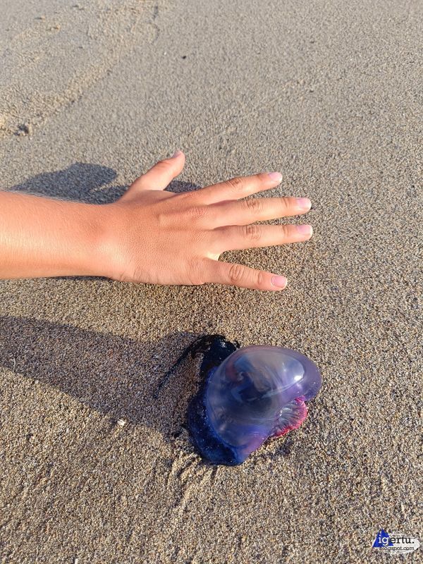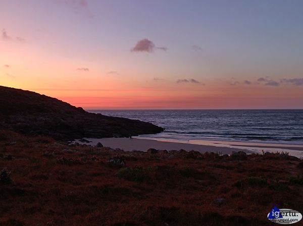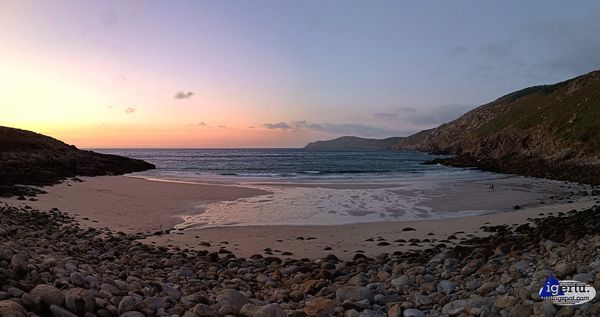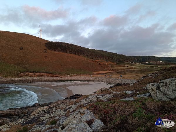 Bajamos a dormir en playa de Moreira, una hermosa cala, aquí como en la costa de Bizkaia también han llegado las carabelas portuguesas. El viento de NE sopla con ganas este atardecer de tonos rosáceos.